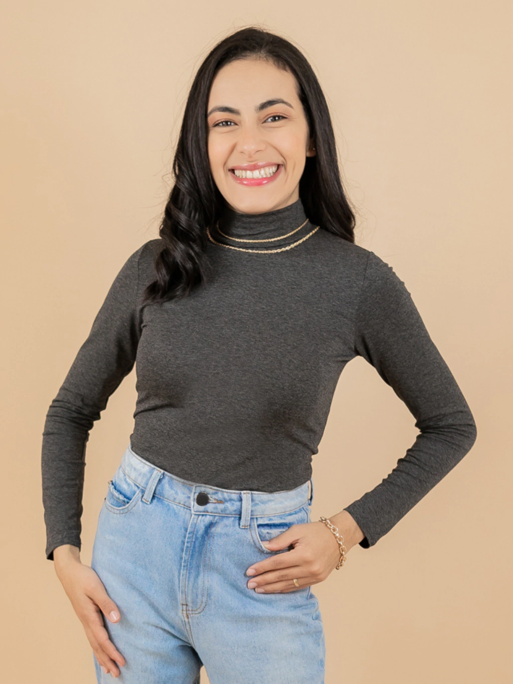 Blusa Cacharrel Gola Alta Manga Longa Segunda Pele de Viscolycra Chumbo